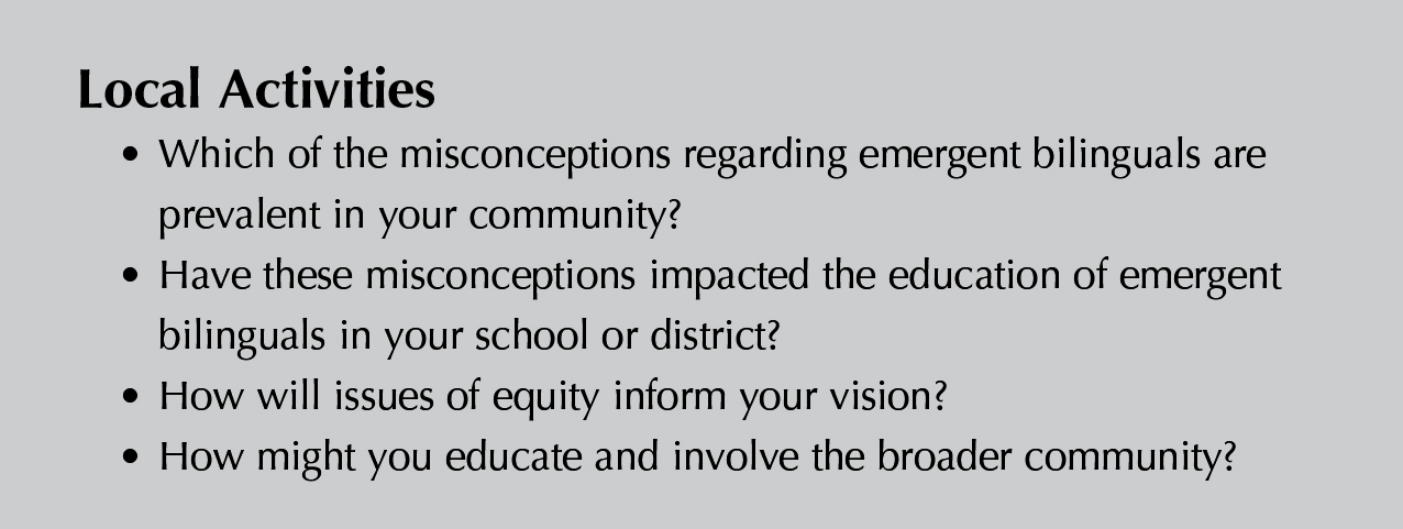 These types of misconceptions about emergent bilinguals are pervasive and affect decision-making at all levels: classroom, school, district, and state. Programs and services for emergent bilinguals must be grounded on the standing theories and research in the field. A necessary starting point is to become knowledgeable about the complexities of acquiring a second language, the socio-emotional aspects of navigating a new culture, and how the socio-political environment affect emergent bilinguals and their families.
