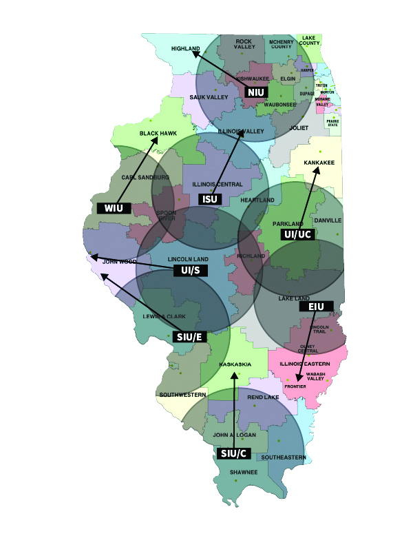What is proposed may be described as a “new-old” idea. In the late-1970s, Illinois State University (ISU) sent its College of Education faculty approximately 60 miles north from its main campus to Illinois Valley Community College (IVCC) in Oglesby. Students who had already earned the associate degree were able to take the full sequence of ISU junior and senior education courses at IVCC, thus completing their teacher preparation and earning a baccalaureate degree at home. Students from this special partnership quickly filled faculty vacancies in the local school districts.